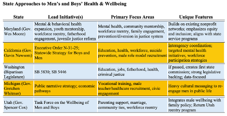 Across the United States, governors from both major political parties are beginning to address what has long been an overlooked public health and social challenge: the wellbeing of men and boys. California, Michigan, Utah, Washington, and now Maryland are building state-level agendas that recognize the specific needs of this population, needs that intersect with family stability, economic mobility, and thriving communities. While the strategies vary, they share a common goal: to improve outcomes for men and boys in ways that strengthen the social fabric for everyone.