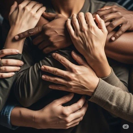 AI image: A cropped photo showing hands on shoulders or arms wrapped in solidarity—no faces, just the gesture of connection.