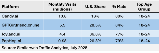 Excitement around this year’s two-week Wimbledon tournament ran high, with ESPN reporting it as the most-watched edition in six years and averaging 721,000 viewers across 250 hours of coverage. As a young person, I tuned in annually for big matches. My friends and I would gather on community courts to play (awfully), while also reenacting some of the McEnroe antics during those summer months. This summer, social interaction is in transition, as fewer young people run to the local tennis courts to whack a ball around. Instead, a growing number are turning to AI companions for social and romantic engagement through sites like Candy.ai. In one month, Candy.ai drew more than 10 million visits (~80% from young men aged 18–24) underscoring this shift in socialization away from real-life interactions.