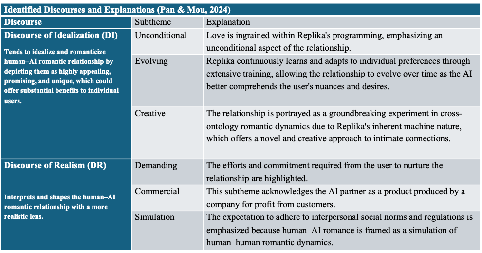 Pan, H., & Mou, Y. (2024). Human–AI romantic relationships: Discursive constructions among Replika users. Computers in Human Behavior, 146, 1090–1091.