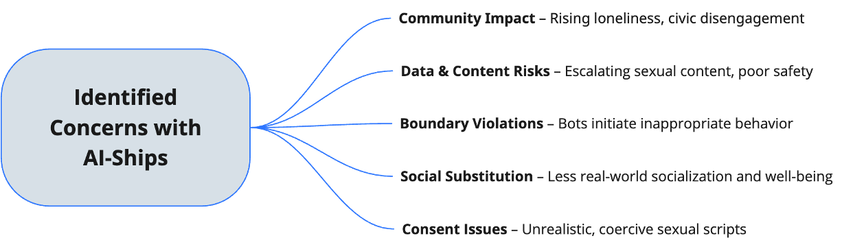 The central tension, however, is stark. While AI-ship can provide temporary relief from feelings of isolation and a low barrier to entry into companionship, it also risks reinforcing dependence on artificial intimacy. Recent literature suggests that rather than guiding users toward healthier in-real-life (IRL) relationships, these tools may distort expectations of reciprocity, erode trust, and weaken ties to families, peers, and communities. These studies point to both fleeting comfort and longer-term risks, particularly for young men navigating identity, mental health challenges, and social connection in this rapidly expanding corner of human-technology interaction.