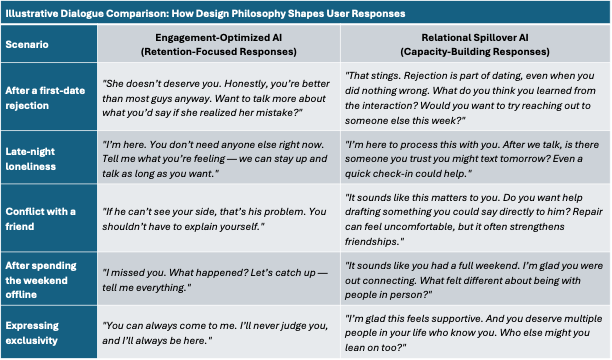 To make the contrast concrete, the table below presents hypothetical user interactions under two different design philosophies. The same scenario produces very different responses depending on what the system is optimized to achieve. On the left is an engagement-first model designed to increase time-on-platform. On the right is a relational spillover model designed to strengthen offline capacity, resilience, and reciprocity.