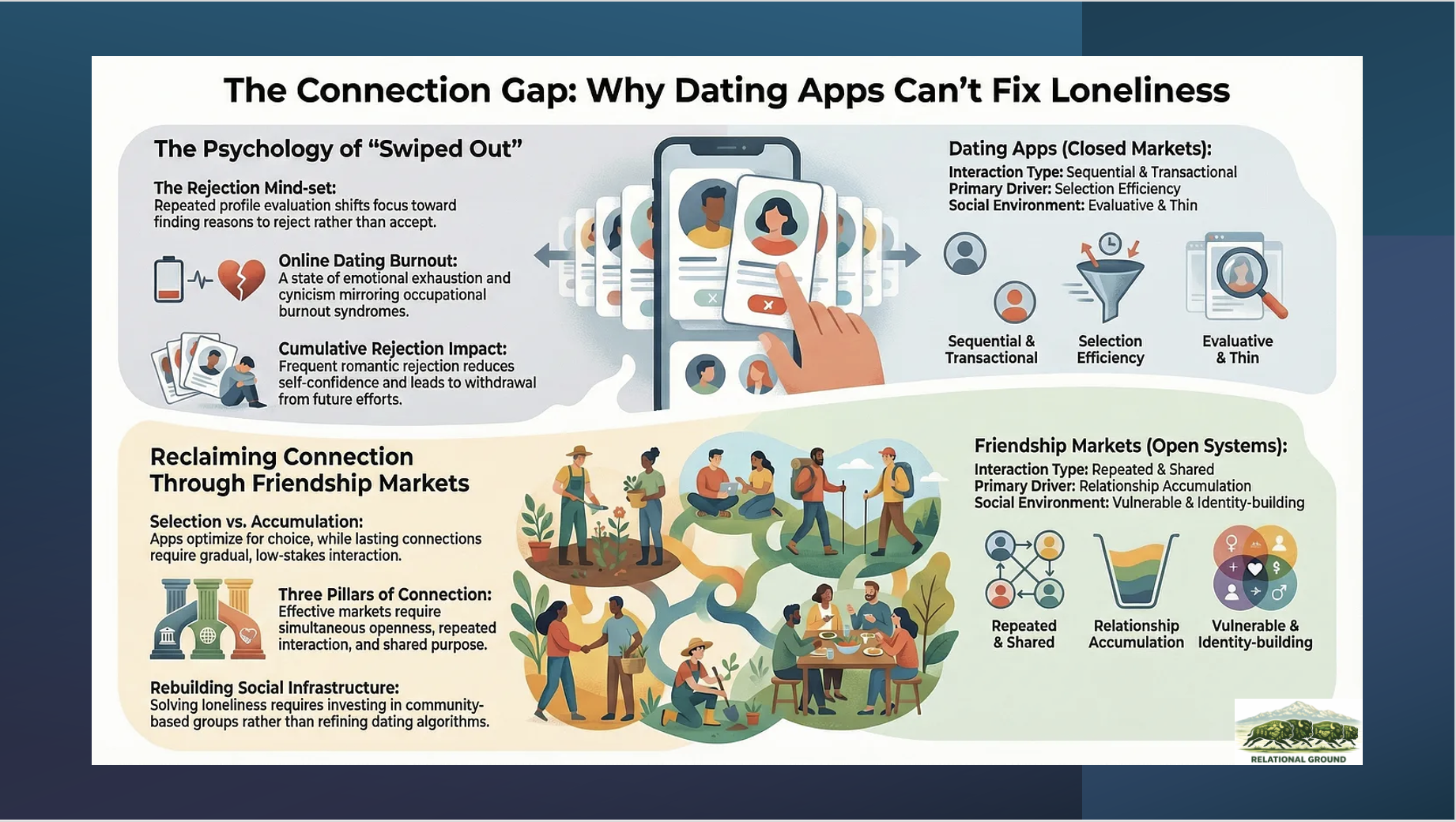 This essay wasn’t designed to dump on dating apps, but to highlight how they ineffectively reduce men’s loneliness and can be structurally misaligned with the kinds of social environments that produce durable connections. The conclusions presented are not drawn from personal nostalgia for an earlier era of dating, but from a growing body of empirical research that raises serious questions about whether the benefits of these platforms outweigh their costs for many users. Drawing on research from social psychology, communication, and public health, I describe dating apps within a broader framework of friendship markets: the social contexts that make relationship formation possible in the first place.